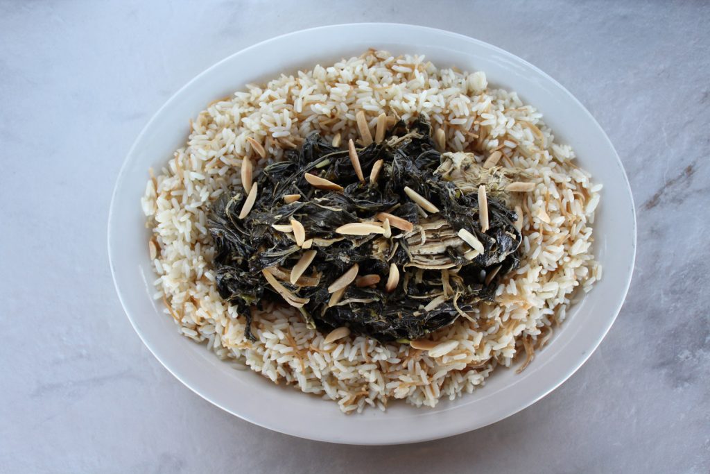 Moloukhia is a green leafy vegetable similar to spinach and kale. We cook the leaves with deboned chicken marinated in lemon and garlic and serve the dish over rice pilaf. The bright flavors from the lemon and garlic pair so well with the greens and chicken. This is a Levantine dish that is very popular in the region. It is also quite healthy, as the leaves are rich in vitamins and antioxidants. Moloukhia has been eaten for centuries, with records of the plant’s cultivation dating back to Ancient Egypt. This versatile vegetable is used in cuisines all over the world, especially in the Middle East and Africa.