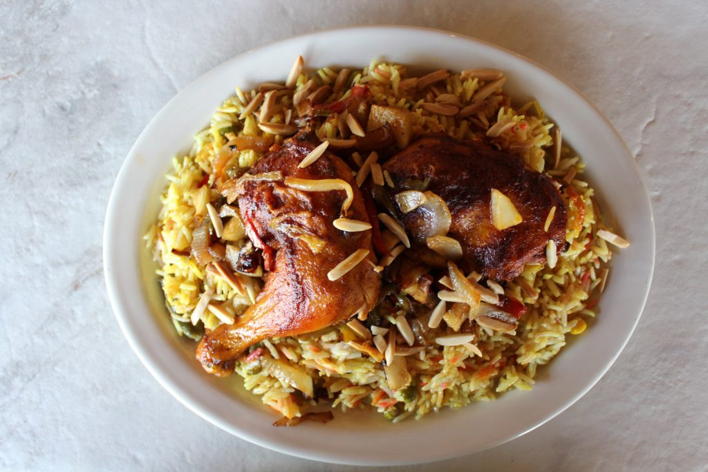 Our maklooba comes with oven-roasted chicken served over a bed of basmati rice mixed with fried eggplant and cauliflower. Maklooba is an Arabic word that literally means “flipped over,” and stems from this dish traditionally being layered in a pot and then flipped over onto a serving dish. This dish is native to the Levantine region, and is especially popular in Palestine. There are records of maklooba being prepared that date back to the 13th century!